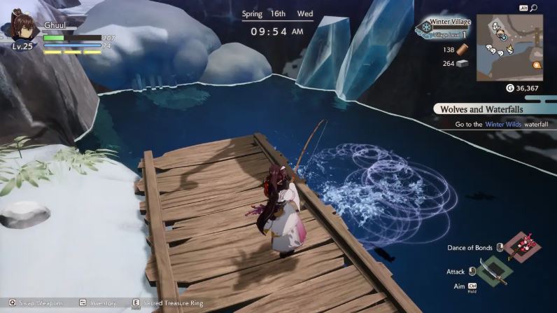 To begin your journey as a seasoned fisher, progress through the main story until you reach the questline “Searching for the Winter God.” At this stage, you’ll meet Watarase, the gentle fish spirit who introduces you to fishing and hands over your first Fishing Rod along with the PescaPedia, a logbook that tracks every aquatic species you catch.
